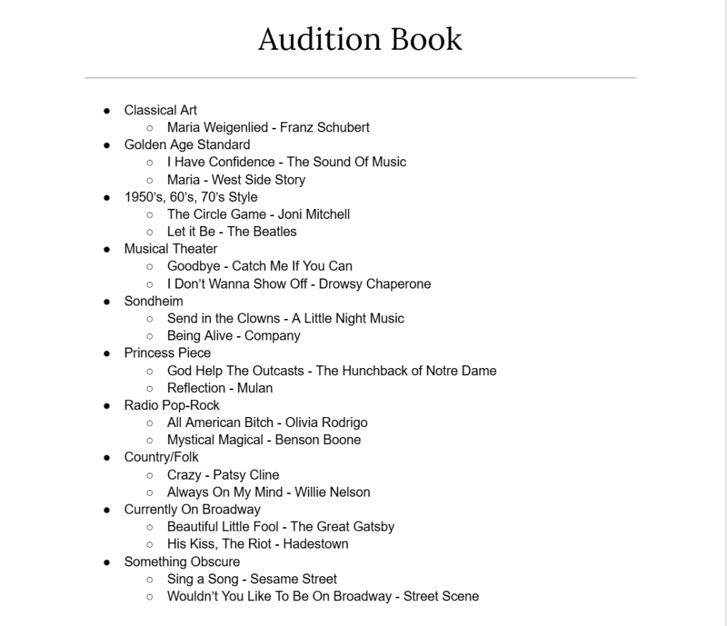 This is probably the category you will have the most of already. This contains any musical theater from 1960 to today. My suggestion for this category is not to include any Sondheim or princess-style songs, as well as anything that is currently on Broadway, as those will have their own subcategories and will be needed for specific auditions. Instead, include ballads, character pieces, belty, and head voice songs to round out your book.